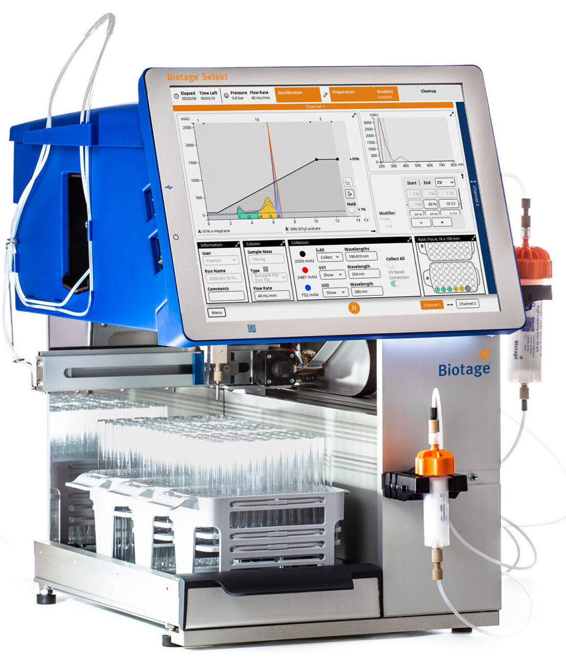 除了實驗室規模的系統外,Biotage®亦針對商業化量產,推出大型快速管柱純化系統。這些大型系統也適用於目標化合物在放大研究、製程開發及試量產階段的純化需求。在實際操作中,穩定性與安全性是任何生產等級儀器的核心要素。Biotage® Flash 75、150 及 400 系列系統便是為此設計,這些系統利用壓縮空氣進行溶劑傳輸,不僅結構穩定,且維護需求極低。